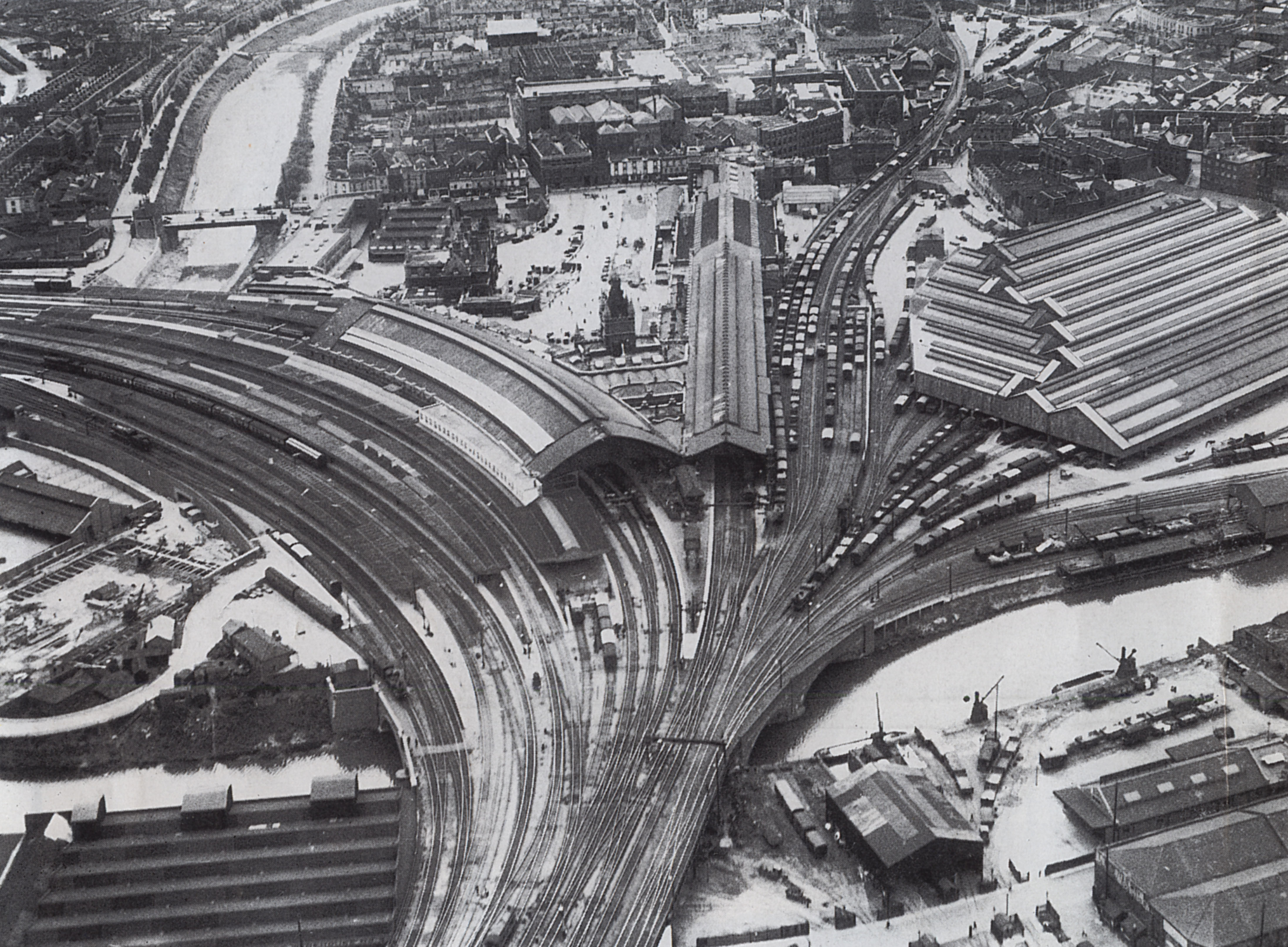 An aerial view of Temple Meads, looking west, probably in the 'thirties, with the passenger station complex to the left and centre, and Temple Meads goods shed on the right. The harbour branch, which also served Redcliffe Goods, can be seen between them.