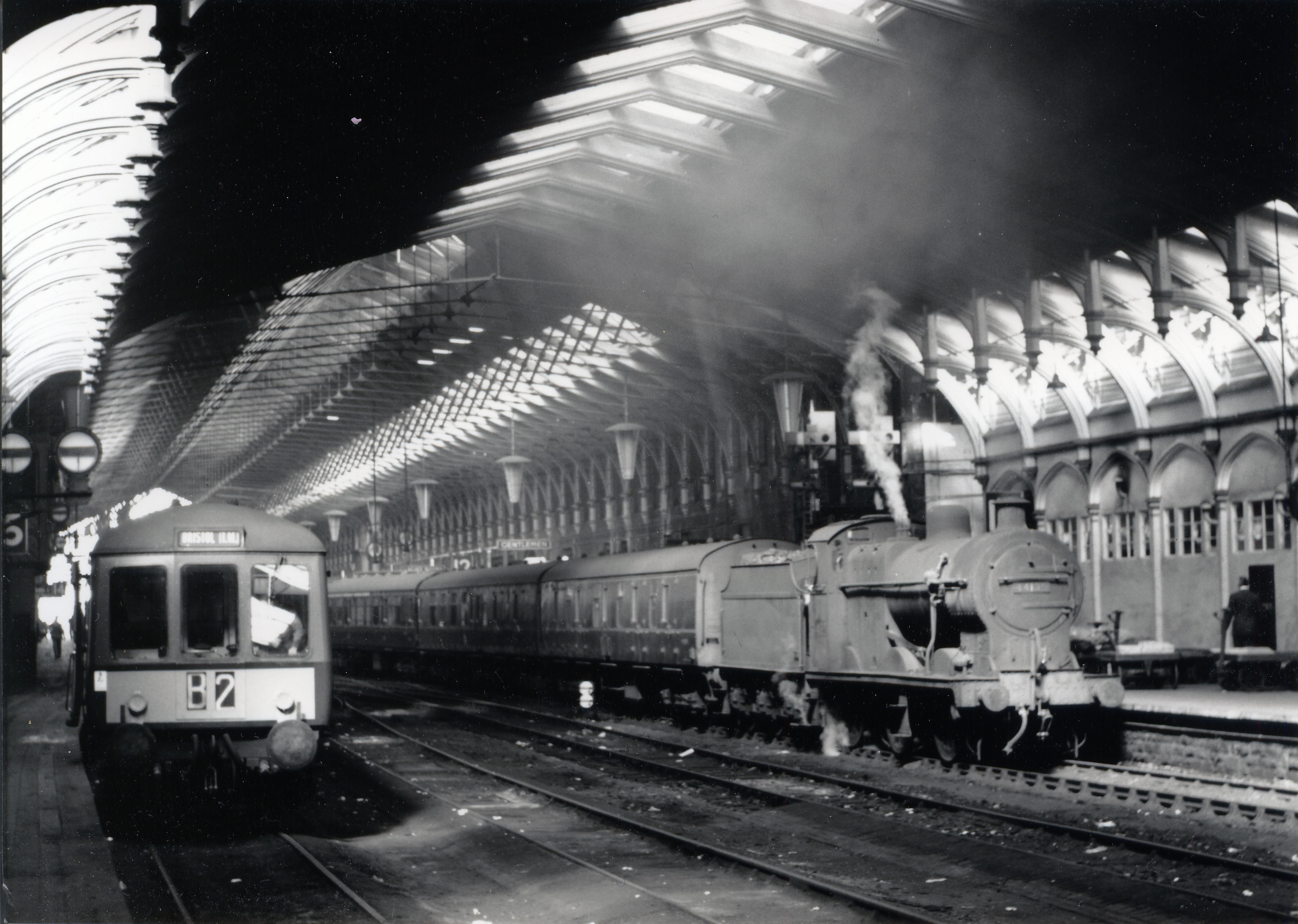 The original train shed remained in use until 12 September 1965 and is seen here on 10 September 1960 after arrival from Gloucester behind 4-6-0 44804. The back of the train is at platform 12 and the front at 13. In the 1880s these has been departure platforms for the Midlands and South Wales respectively. There were two berthing roads in the centre, with platforms 14 and 15 against the north wall. The building is now used mainly for car parking and is Listed Grade 1. The "Empire and Commonwealth" exhibition opened in part of it in September 2002.