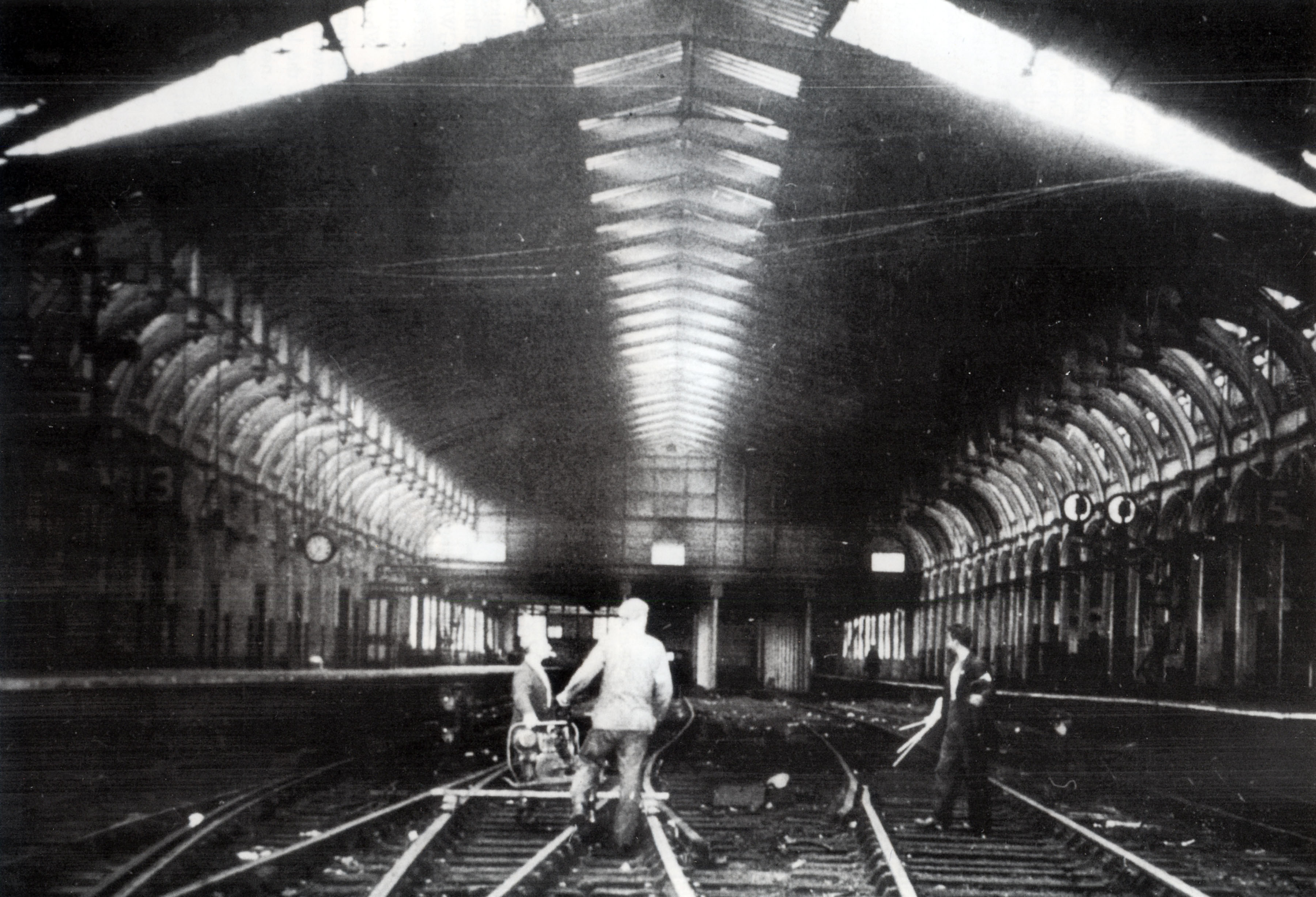A rare view of the interior of Brunel's terminus, with track maintenance in hand. Taken in 1958 when the station was still in use, this shows the junction of the original roof with the later extension by Digby Wyatt, and the addition of the larger vents at the ridge. In the background the trackwork between the pillars in the former Engine and Carriage Shed area extends to the rear of the Office Block, with the widened arrival platform on the left (accomplished by the loss of one of the original broad gauge tracks) and partially widened Departure platform on the right.