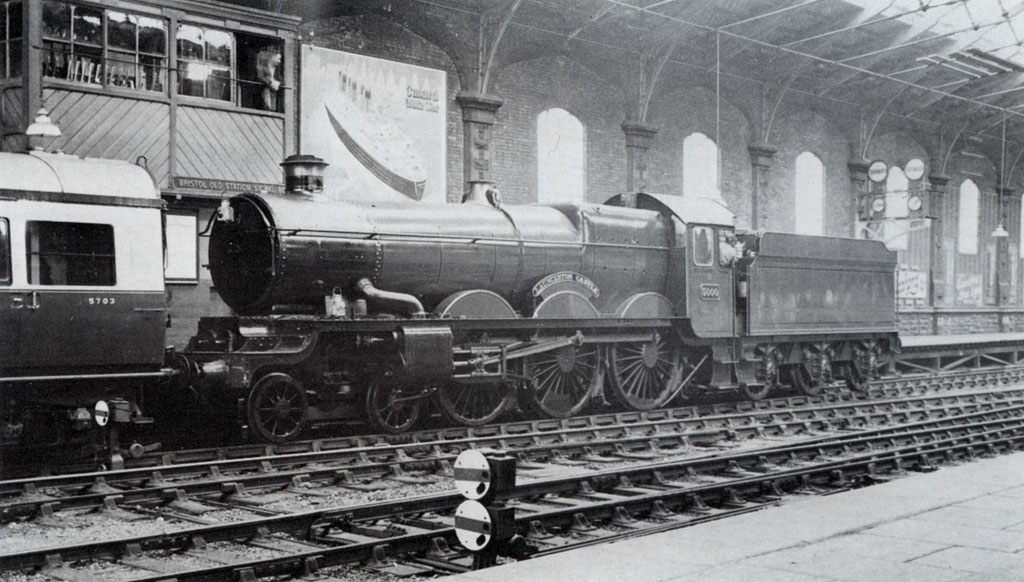 5000 Launceston Castle in pristine condition stands next to Bristol Old Station Signal Box, within the 1870s extension to Brunel's train shed.