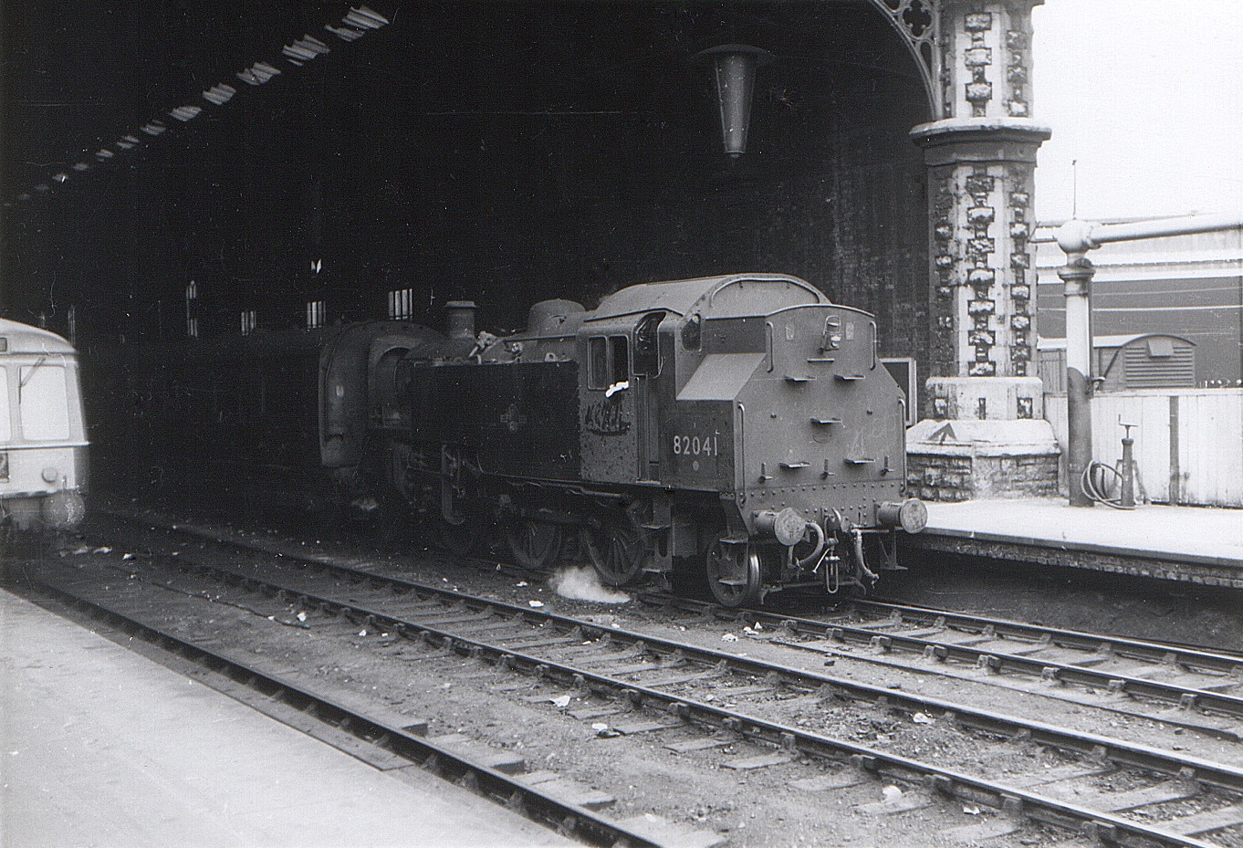 82041 Platform 14 Bristol Temple Meads Old Station 16 July 1965 presumably on a Bath Green Park service. A DMU sits in Platform 12.